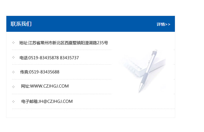 地址:常州市新北區友邦商務大廈1幢16、17層  電話:0519-85101652  傳真:0519-85112595  郵編:213022  網址:www.cz-jiayue_cn.xiayinxm.com  郵箱:xiajifengaa@163.com